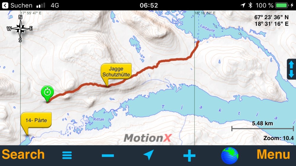Auch das Höhenprofil mit lediglich gut 400 Höhenmetern war überschaubar, sodaß wir nach diversen Päuschen und 4 Stunden reiner Laufzeit (die mitlaufende Tracking-App weiß sowas immer ganz genau!) recht entspannt gegen 15:30 am Ufer des Laitaure Sees ankamen.