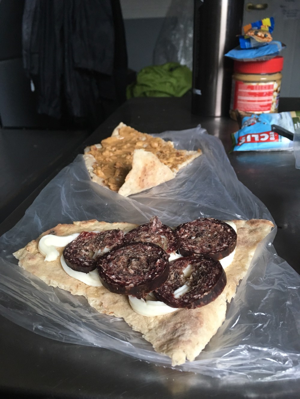 So erreichten wir schon nach weniger als 2 Stunden eine Schutzhütte bei km 11, die wir dankend als Regenschutz für die Mittagspause nutzten. Es wurde Rentiersalami an Tubenkäse auf Pitabrot gereicht…